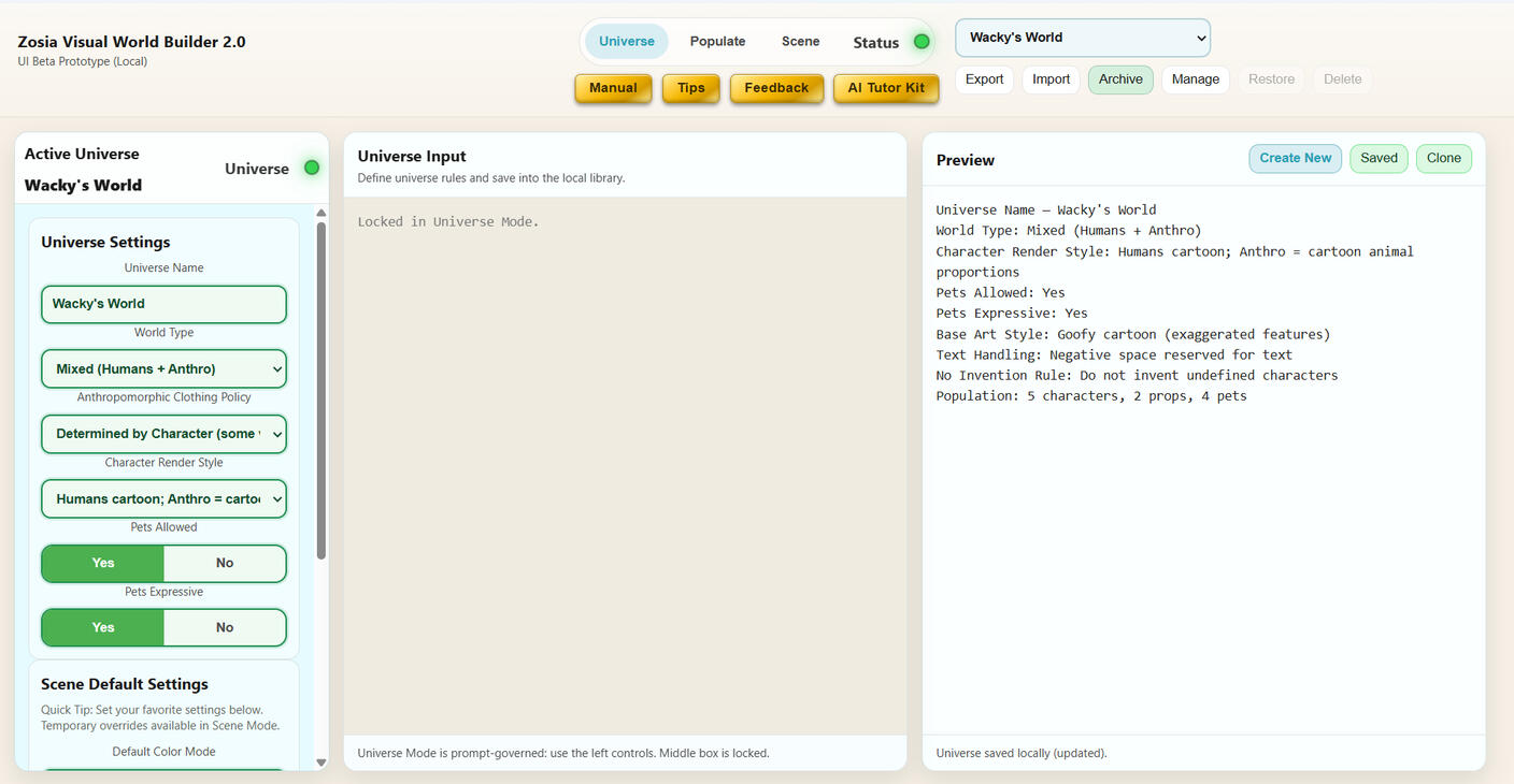 Define Your WorldIn Universe Mode, you set the rules that govern your entire project.Choose your world type, art style, character behavior, and visual constraints. These settings act as the foundation for everything that follows.Once saved, your universe becomes the base that all characters, scenes, and prompts build from.