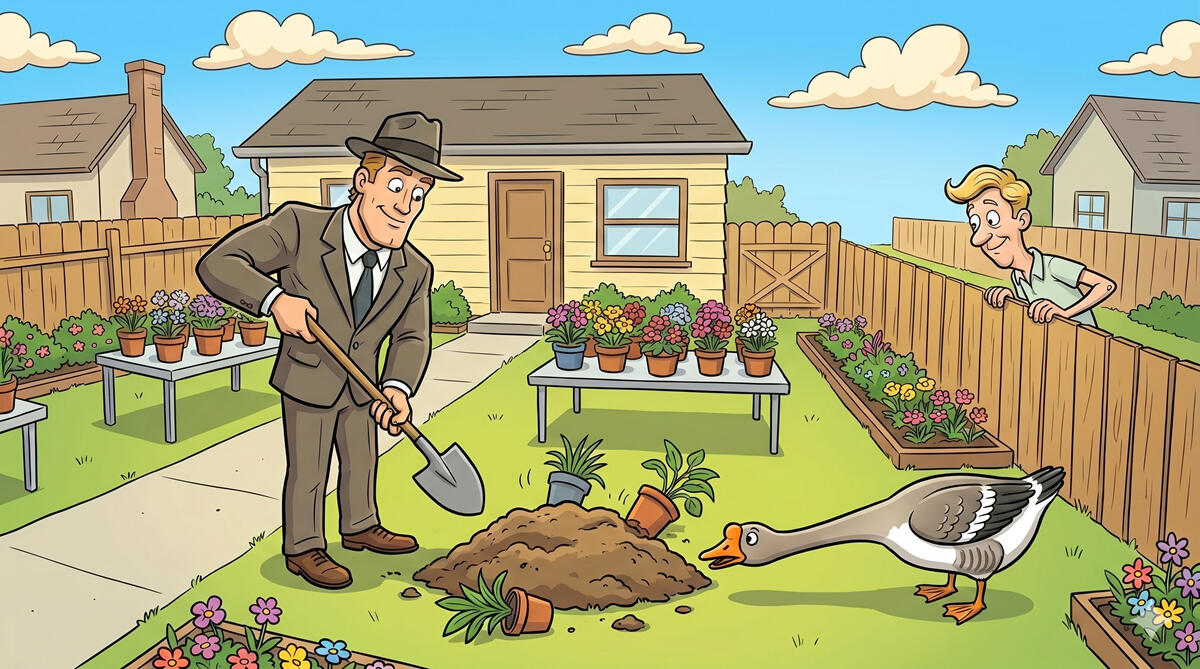 Get the PayoffThis brief scene called Zosia to produce each Character in the sceneHandy Dandy in backyard garden, holding shovel, looking at fresh mound of disturbed soilplants slightly disrupted, flower tables nearbyHarold leaning over fence watchingMillie goose neck stretched toward ground, alertsoil slightly raised in one spot.